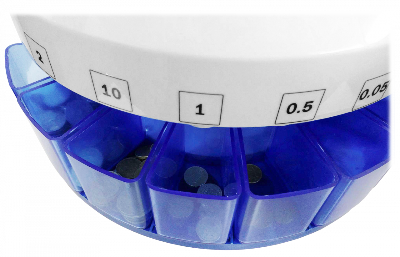 - Возможность просмотра на дисплее как общей суммы и количества просчитанных монет, так и детализации по каждому номиналу.
